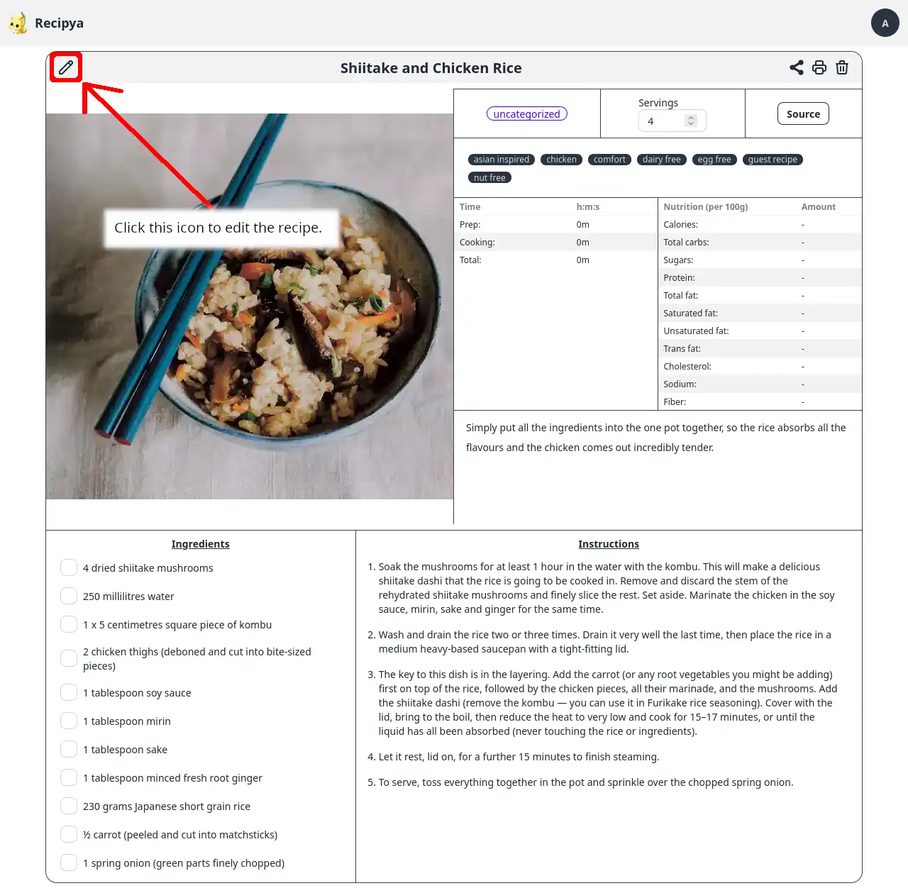 To edit a recipe in your collection, you first must view a recipe. Then, click the pencil icon to the left of the recipe’s title.