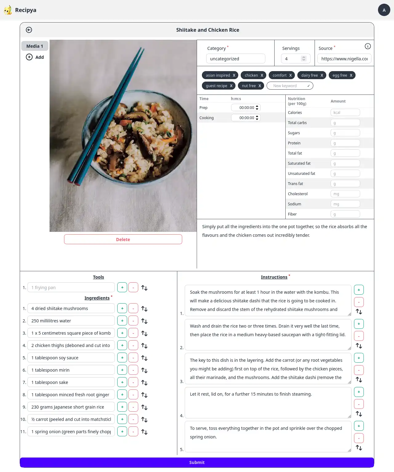 You will enter the edit mode, which allows you to edit any of the recipe’s information. Press the blue Update button at the bottom of the form to save your changes.
